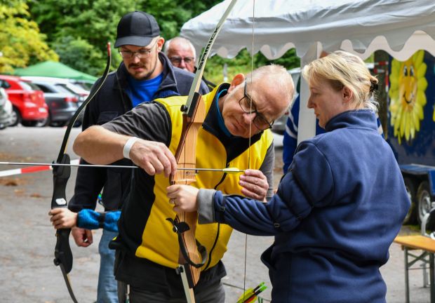 Einen der Neuzugänge im Bilsteintal, einen Werwolf, für den rege nachgefragten Bogenparcours mit Fantasyfiguren nahmen die wiedergewählten Vorstandsmitglieder sowie der Beirat in die Mitte: Bernd Belecke (1. Vorsitzender), Jordis Schulte (Beirat)…